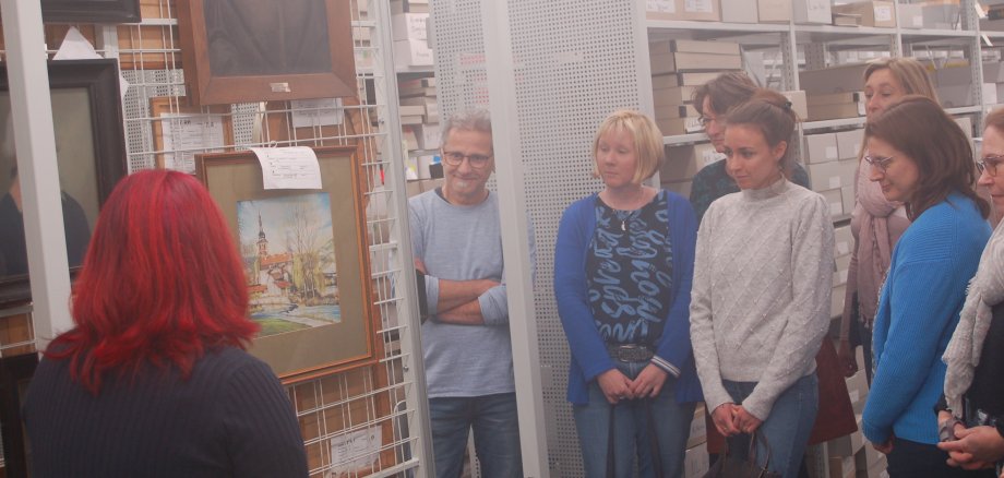Foto: Stefan Meisel und Mitarbeiter*innen wurden von Sarah Förster durch die Magazinräume des Stadtarchivs geführt.