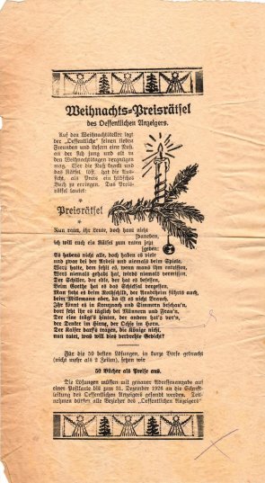 Am 24. Dezember 1926 druckte der Oeffentliche Anzeiger eine mit weihnachtlichen Motiven gestaltete Ausgabe. Auf zwei Sonderseiten griff die Redaktion das Thema des Tages auf: „Weihnachten“. Liebevoll gestaltet hatte sie C.W. Kiesseich. Mit Weihnachtsbäumen und Tannenzweigen, geschmückt mit leuchtenden Kerzen, Engeln und Girlanden aus Tannengrün, Glocken, Lebkuchen und Spielzeugsoldaten gewunden und darüber arrangiert ein Dorf, in tiefverschneiter Winterlandschaft. Die auf den Seiten abgedruckten Gedichte und Geschichten zum „Fest der Liebe“ sollten und konnten den Leser auf die vor ihm liegenden Festtage einstimmen. Im alltäglichen Nachrichtenallerlei versteckte sich ein weiteres Glanzlicht der Zeitungsausgabe - das Weihnachtspreisrätsel.