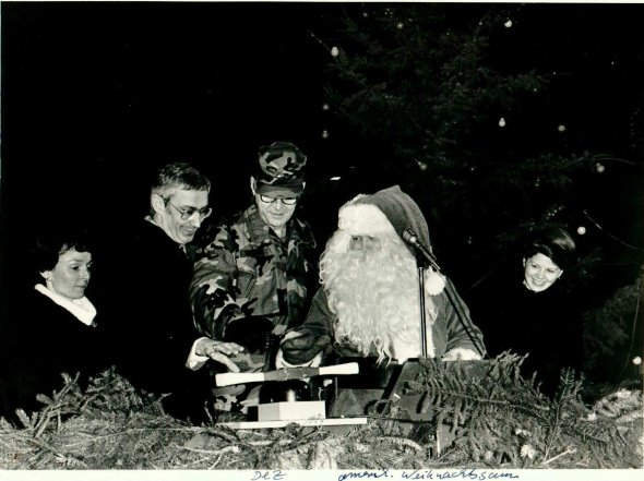 Jahrzehntelang war er an der Alzeyer Straße in der Vorweihnachtszeit nicht zu übersehen und leuchtete weithin: Der Weihnachtsbaum der US Army in der Nähe des Offizierscasinos. Die Beleuchtung wurde im Beisein des Standortkommandanten und des Oberbürgermeisters feierlich eingeschaltet (Foto aus dem Jahr 1985 mit Oberbürgermeister Helmut Schwindt). Weihnachten und die Adventszeit waren für die Soldaten mit ihren Familien und den Einheimischen gleichermaßen wichtig. Auf den Straßen sangen Soldaten und deutsche Mitbürger auf den Straßen deutsche und amerikanische Weihnachtslieder, die Weihnachtskonzerte der US Bigband sind unvergessen. Fast jede Kompanie sammelte für Bedürftige Geld, mit dem Spielzeug, Kleider und Lebensmittel gekauft wurde. Soldaten wiederum waren zu Weihnachtsfeiern in die Häuser und Wohnungen deutscher Gastgeber eingeladen. In den 50 Jahren (1951-2001), in denen amerikanische Soldaten mit ihren Familien hier in Bad Kreuznach lebten, sind viele Freundschaften entstanden, die zum Teil noch heute bestehen. (Hansjörg Rehbein)