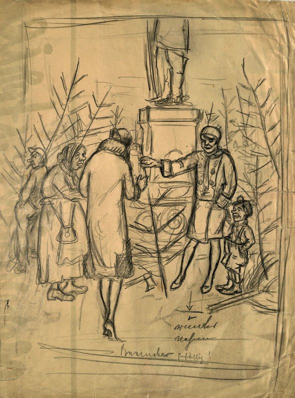Mit seinen Werbezeichnungen, Grafiken, Kinoreklamen, Dekorationsentwürfen, Karikaturen, illustrierten Geschichtchen, Gemälden und Postkarten hatte sich Jacob Thon nach dem Konkurs seiner Getreidegroßhandlung 1923 und dem darauffolgenden Aufbau eines Reklame-Ateliers schnell einen Namen gemacht. In seinem Nachlass finden sich daher einige Zeichnungen und Werbeentwürfe für Anzeigen zur Adventszeit. Hervor stechen darunter Bleistiftzeichnungen, die durchaus mit humoristischem Anklang Brauchtum, Ereignisse und Alltagsgeschehen in der Vorweihnachtszeit aufgreifen – wie der hier vorgestellte Weihnachtsbaumverkauf. (Franziska Blum-Gabelmann)
