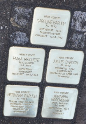 Fünf Stolpersteine für die fünf NS-Opfer der Familie Baruch vor dem Haus in der Hochstraße 38Das erste Projekt der AG übernahmen die Integrierte Gesamtschule Sophie-Sondhelm und das Lina-Hilger-Gymnasium. Vor dem ehemaligen Wohnhaus der Familie Baruch in der Hochstraße 38 wurden fünf "Stolpersteine" verlegt, die an die Ermordung durch die Nationalsozialisten erinnern. Ein weiterer Stolperstein liegt zur Erinnerung an Auguste Oppenheimer in der Römerstraße vor dem Haus Nummer 2.