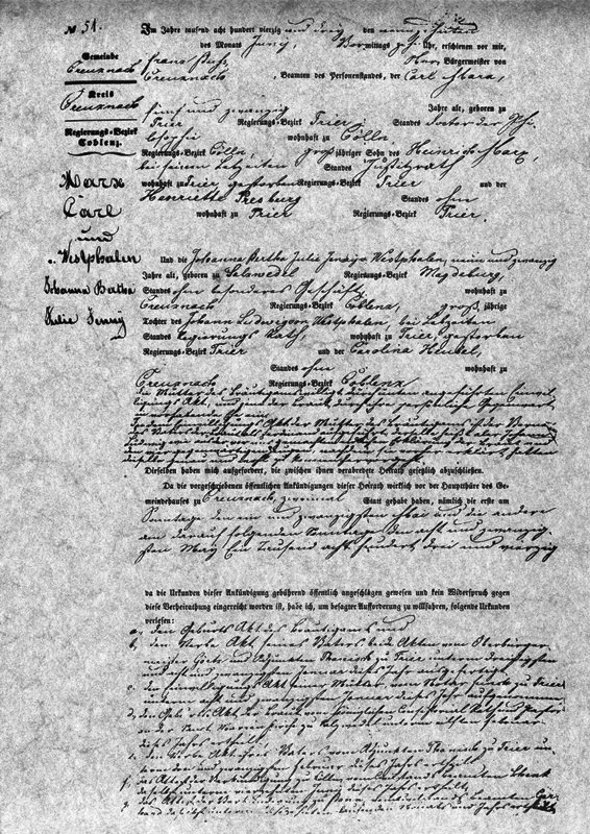 Im Personenstandsregister der Stadt Kreuznach von 1843 wurde am 19. Juni 1843 unter der Nr. 51 die Eheschließung von Dr. Karl Marx (1818-1883) mit Jenny von Westphalen (1814-1881) eingetragen, nachdem Oberbürgermeister Franz Buss (1790-1883) der Aufforderung des Paares gefolgt war, die zwischen dem Brautpaar „verabredete Heirath gesetzlich“ vorzunehmen. Dem vorausgegangen war die vorgeschriebene öffentliche Ankündigung am 21. und 28. Mai. Diese war vor der Haupttür des Gemeindehauses in Kreuznach erfolgt und hatte keinerlei Widerspruch nach sich gezogen, der gegen eine Vermählung gesprochen hätte.