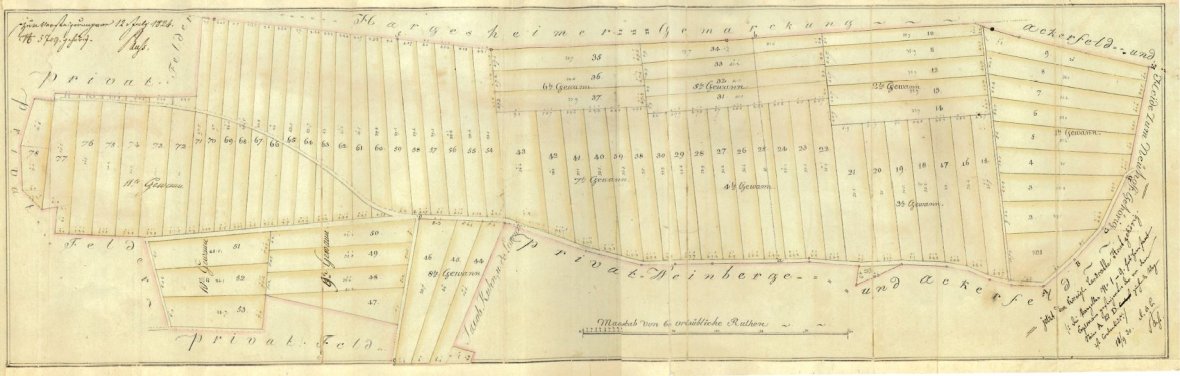 Am 5. Juli 1821 erteilte Oberbürgermeister Franz Xaver Buss (1790-1883) dem Geometer Wenzel den Auftrag, den Firnsel zu vermessen und ihn in Parzellen von jeweils ein Morgen einzuteilen. Dazu wurde neben dem Vermessungsplan über das „Schähl-, Wald-, und Heidefeld“ Firnsel ein Vermessungsprotokoll angefertigt. Auf dem Vermessungsplan sind elf Gewanne eingerichtet, die in Parzellen untergliedert wurden.