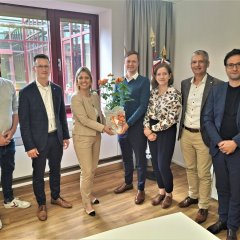 OB Letz und Geschäftsleitung Nathalie Herberger, zuständig für Städtepartnerschaften und Internationale Beziehungen, begrüßen neben Bürgermeister Nico Ruhle folgende Gäste: Baudezernent Jan Juraschek, Kulturamtsleiter Mario Zetzsche, Guido Gerlach, kaufmännischer Leiter/Prokurist der Stadtwerke Neuruppin sowie Magdalena Yansin, Beauftragte für Städtepartnerschaften.