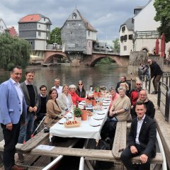 Die Delegation genoss zudem eine Rundfahrt auf der Nahe zusammen mit Mitgliedern des Partnerschaftsausschusses und des Fördervereins für Städtepartnerschaften. Durch den kundigen GuT-Geschäftsführer Michael Vesper lernten die Gäste auf der Bootsfahrt die Geschichte der Stadt und die Hintergründe des Bad Kreuznacher Hochwasserschutzes kennen, der sich seit mehr als 20 Jahren bewährt hat. Das Weinanbaugebiet Nahe und die Besonderheiten dieser traditionsreichen Weinregion wurden durch Naheweinmajestät Laura Ludwig kurzweilig vermittelt.