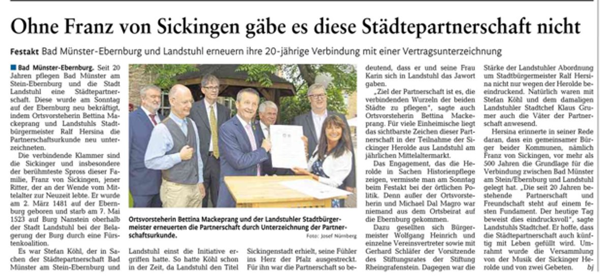 Der Stadtbürgermeister der Sickingenstadt Landstuhl, Ralf Hersina, bedankte sich herzlich für die Einladung auf die Ebernburg. Durch zahlreiche Begegnungen zwischen Vereinen und Organisationen sowie der mehrfachen Teilnahme der Sickinger Herolde an den Mittelaltertagen in Bad Münster am Stein–Ebernburg sei diese Partnerschaft über all die Jahre mit Leben erfüllt worden. Er richtete seinen herzlichen Dank an alle, die sich in den 20 Jahren für diese Freundschaft engagiert haben, denn „eine Städtepartnerschaft lebt von den Begegnungen zwischen den Menschen der beteiligten Kommunen“, so der Stadtbürgermeister weiter.