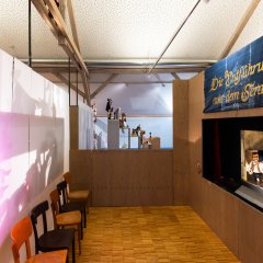 Die Innengestaltung des Aufführungsraumes weist einige Besonderheiten zur Puppentheatergeschichte auf: Die Theaterloge ist mit einem historischen Kandelaber der Reisebühne des Salzburger Marionettentheaters geschmückt (ca. 1950) und beinhaltet außerdem eine Vitrine mit Figuren zu „Der kleine Prinz“ von Fritz-Herbert-Bross (ca. 1970).