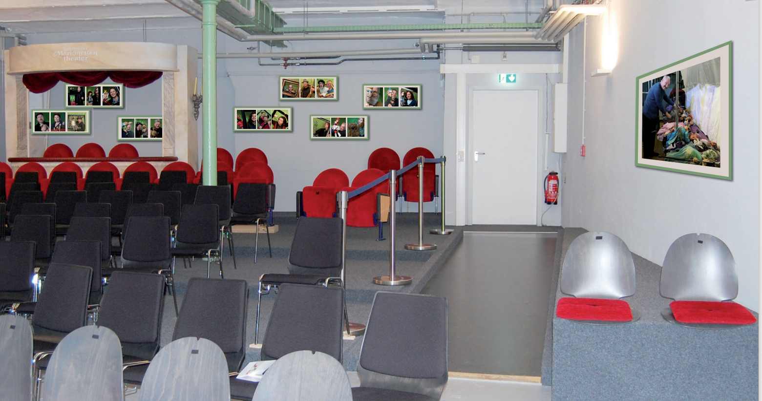 Großformatige Fotoplakate und kleine Portraitaufnahmen an den Wänden zeigen Einblicke hinter die Kulissen von klassischen Puppenbühnen und spiegeln die Vielfalt der PuppenspielerInnen des zeitgenössischen Figurentheaters wieder (Auswahl von Fotos eines lang angelegten Foto-Dokumentations-Projektes des PuK-Museums aufgenommen vom Bad Kreuznacher Fotografen Gerhard Kind).