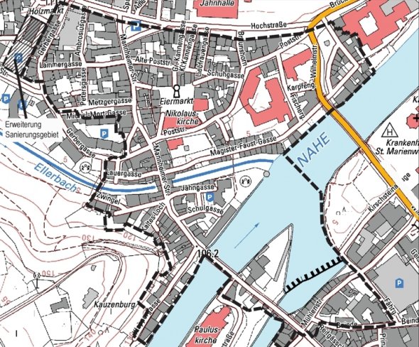 Es lag daher im öffentlichen Interesse, dass die zukünftige Nutzung und Gestaltung des Areals auf die Ziele und Maßnahmen des Sanierungs- und des Fördergebiets abgestimmt wurden. Hierzu bedurfte es wirksamer baurechtlicher und förderrechtlicher Steuerungsinstrumente. Deshalb wurde das Sanierungsgebiet um die entsprechenden Grundstücke 231/2, 34/4 und 231/9 erweitert. Auf Grund der speziellen Problematik in der Kreuznacher Neustadt und dem damit verbundenen Sanierungs- und Modernisierungserfordernis im Bereich privater Bausubstanz wurde es für sinnvoll erachtet den stadtbildprägenden Eingangsbereich in das Sanierungsgebiet „Kreuznacher Neustadt – historischer Stadtkern“ aufzunehmen.