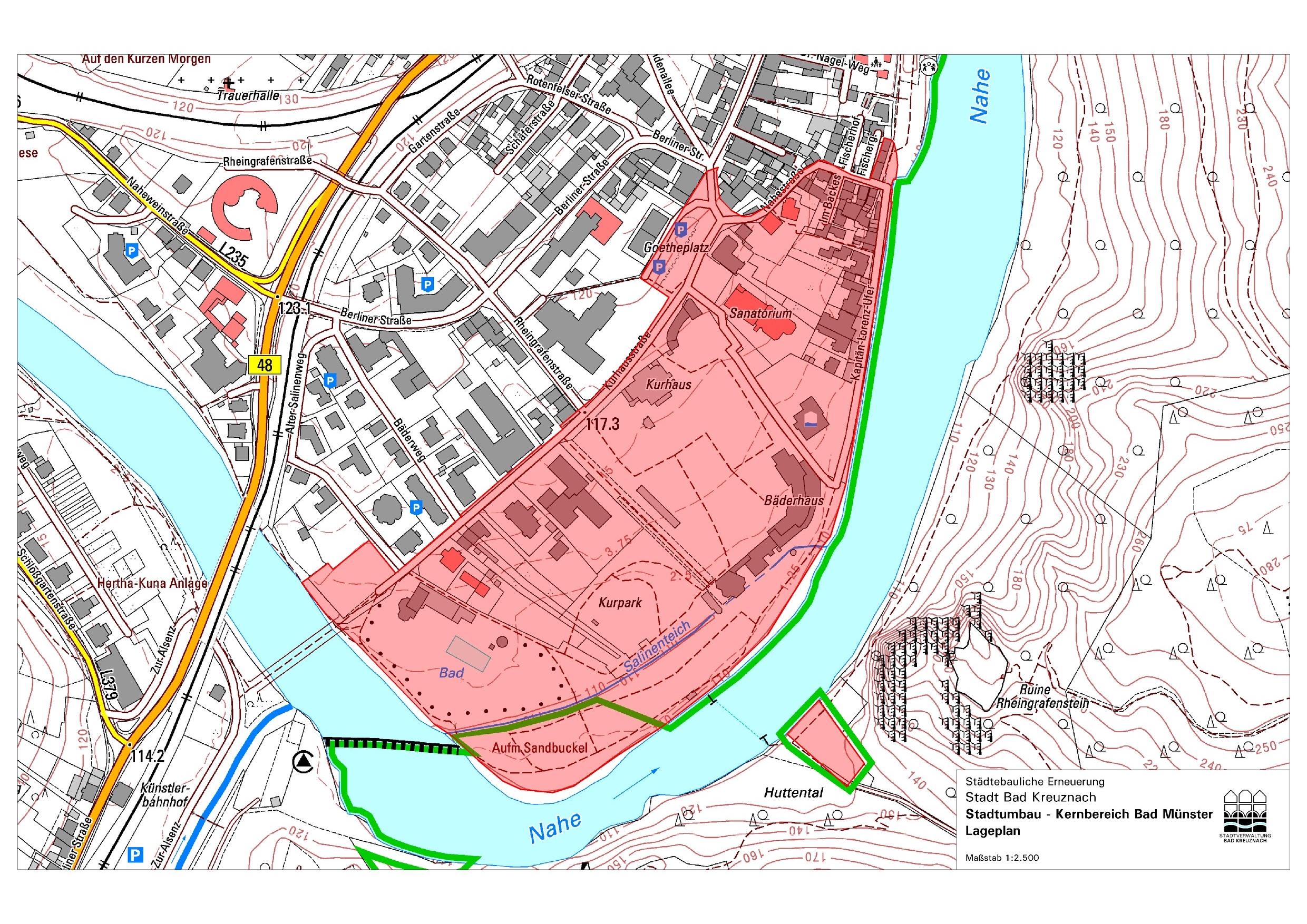 „Der Bad Kreuznacher Stadtteil Bad Münster am Stein-Ebernburg ist stark von strukturellen Veränderungen sowie zunehmend vom wirtschaftlichen und demografischen Wandel geprägt. Gerade der zentrale Kurbereich als Untersuchungsgebiet ist davon in besonderem Maße betroffen. Wesentliche Themen ergeben sich durch die homogene Struktur des Kurgebietes von Bad Münster am Stein-Ebernburg und den Mängeln im öffentlichen Raum: