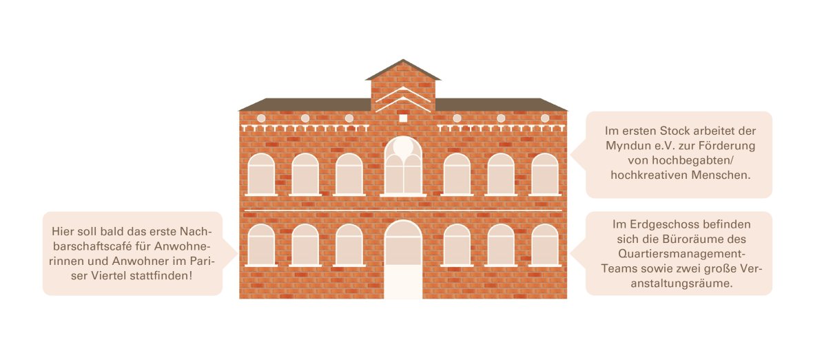 Die ehemalige Grundschule in der Planiger Straße 4 wird seit 2020 als Quartierszentrum des Pariser Viertels genutzt. Das großzügige Gebäude bietet viel Raum für Ideen, die dem Pariser Viertel zugutekommen. Es finden bereits unterschiedliche Angebote statt, in denen Menschen Neues lernen, zusammen Spaß haben oder sich austauschen können.